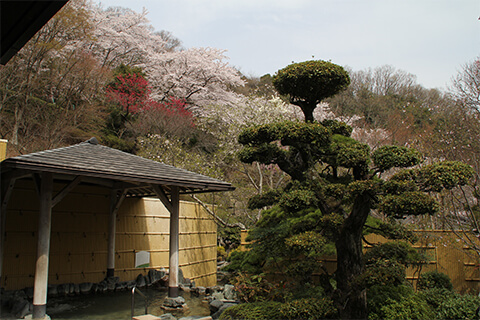 저희 료칸 노천탕의 묘미는 벚꽃ㆍ신록ㆍ단풍과 일본의 아름다운 사계절을 느끼면서 온천욕을 즐기는 위치에 있다는 점입니다 대도시 오사카에서 전철로 불과 30분 거리의, 자연에 둘러싸인 노천탕에서 오사카 제일의 온천욕을 즐길 수 있는 곳은 바로 이곳뿐입니다.