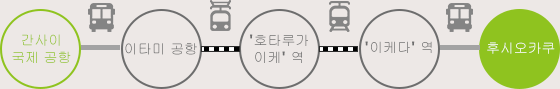 이타미 공항에서 모노레일로 환승하고 '호타루가이케' 역에 하차한 후, 한큐전철로 '이케다' 역까지 오십시오.